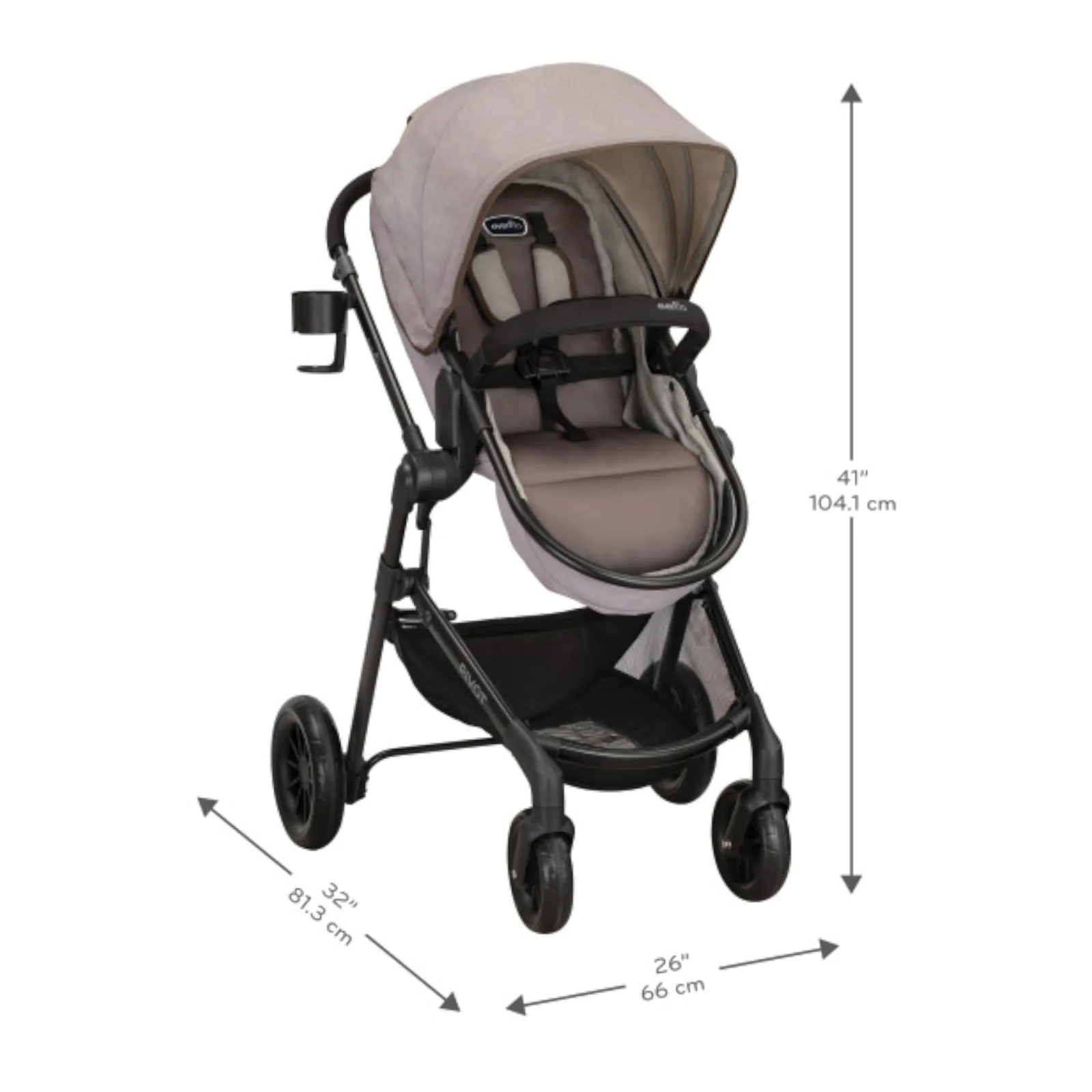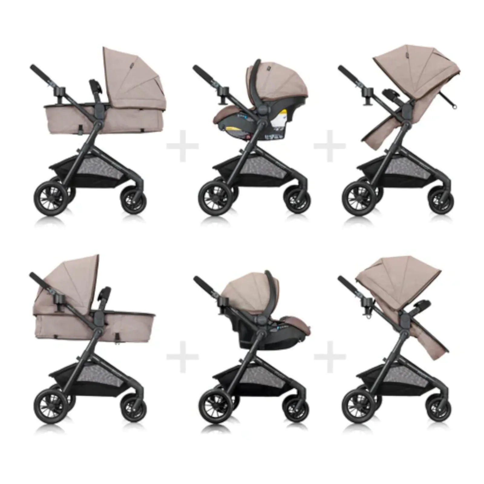 Offers a multi-position modular frame with 6 modes of use! The stroller converts easily from an infant car seat frame stroller to stroller seat and carriage mode. Each mode, baby can face in or out and is easily adjusted. The carriage mode is perfect for infants and offers a cover for chillier days. The new Cruiser Tires have a sleek look and the over-sized rear wheels provide an easier ride.