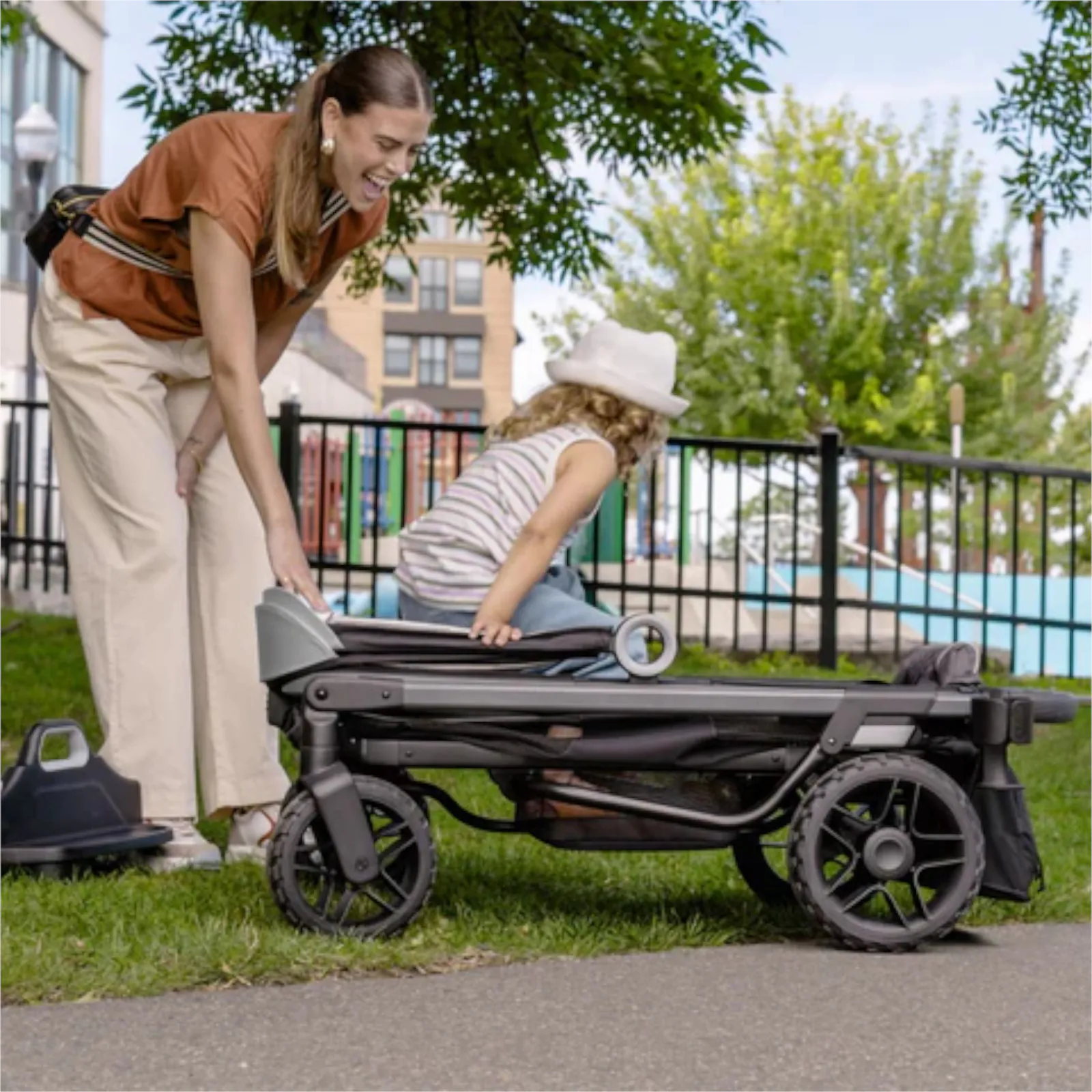 ESCAPE THE EVERYDAY: Rugged-meets-refined stroller wagon engineered for performance features all-terrain, no-flat urethane wheels and rear suspension to take you off the beaten path; accommodates up to two children ages 6 months to 5 years