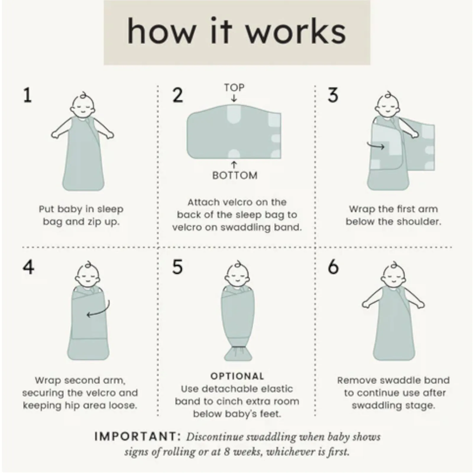 Our Sleep Bag Swaddler is a versatile, all-in-one newborn sleep system made from our signature bamboo rayon This patent-pending design functions as both a secure swaddle and a 1.0 TOG sleep bag It features a removable Velcro swaddle wrap for an adjustable fit and a detachable elastic loop to help create a snugger feel for smaller babies
