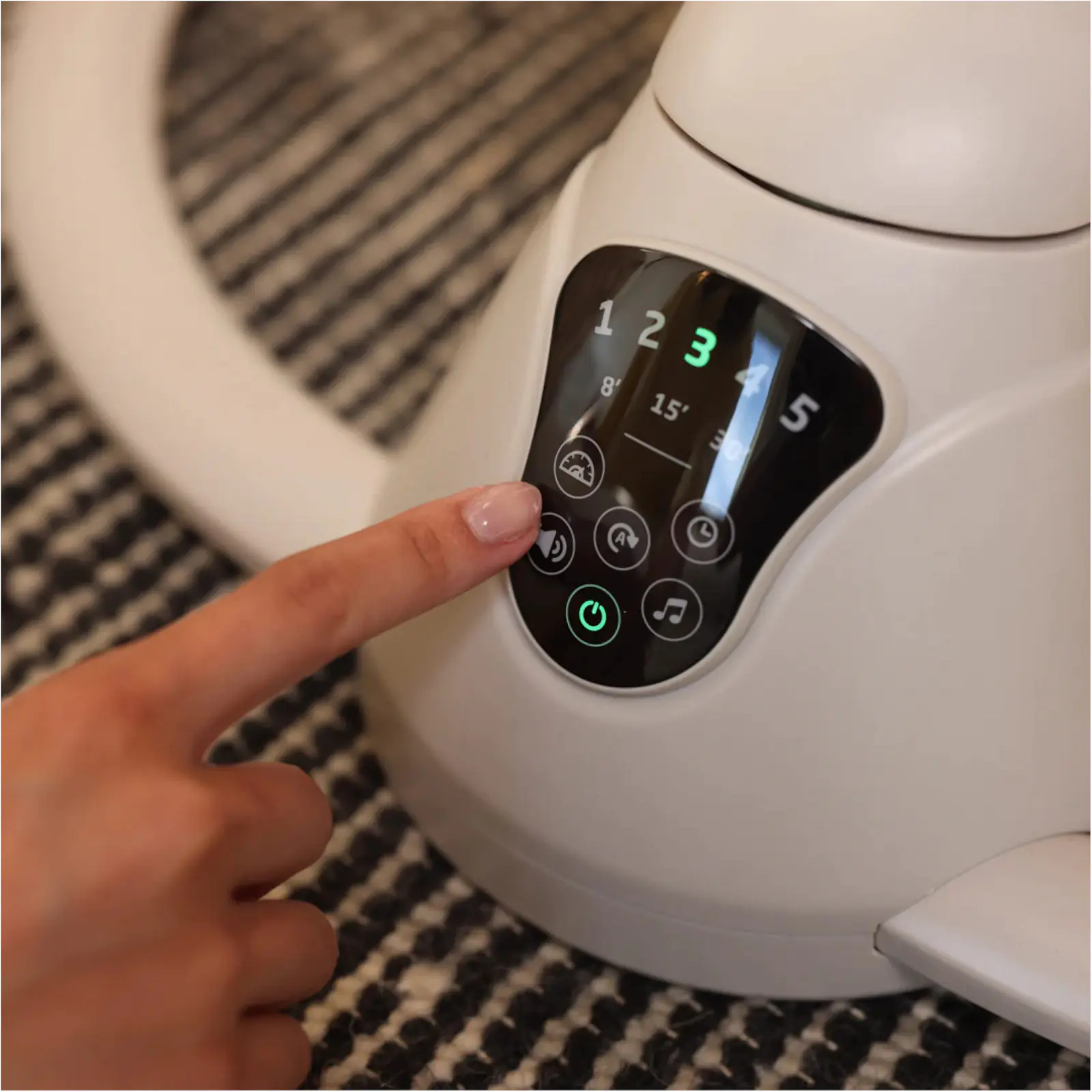 The smart built-in touch screen panel allows you to select from 5 swing speeds, plus 12 melodies and nature sounds.​