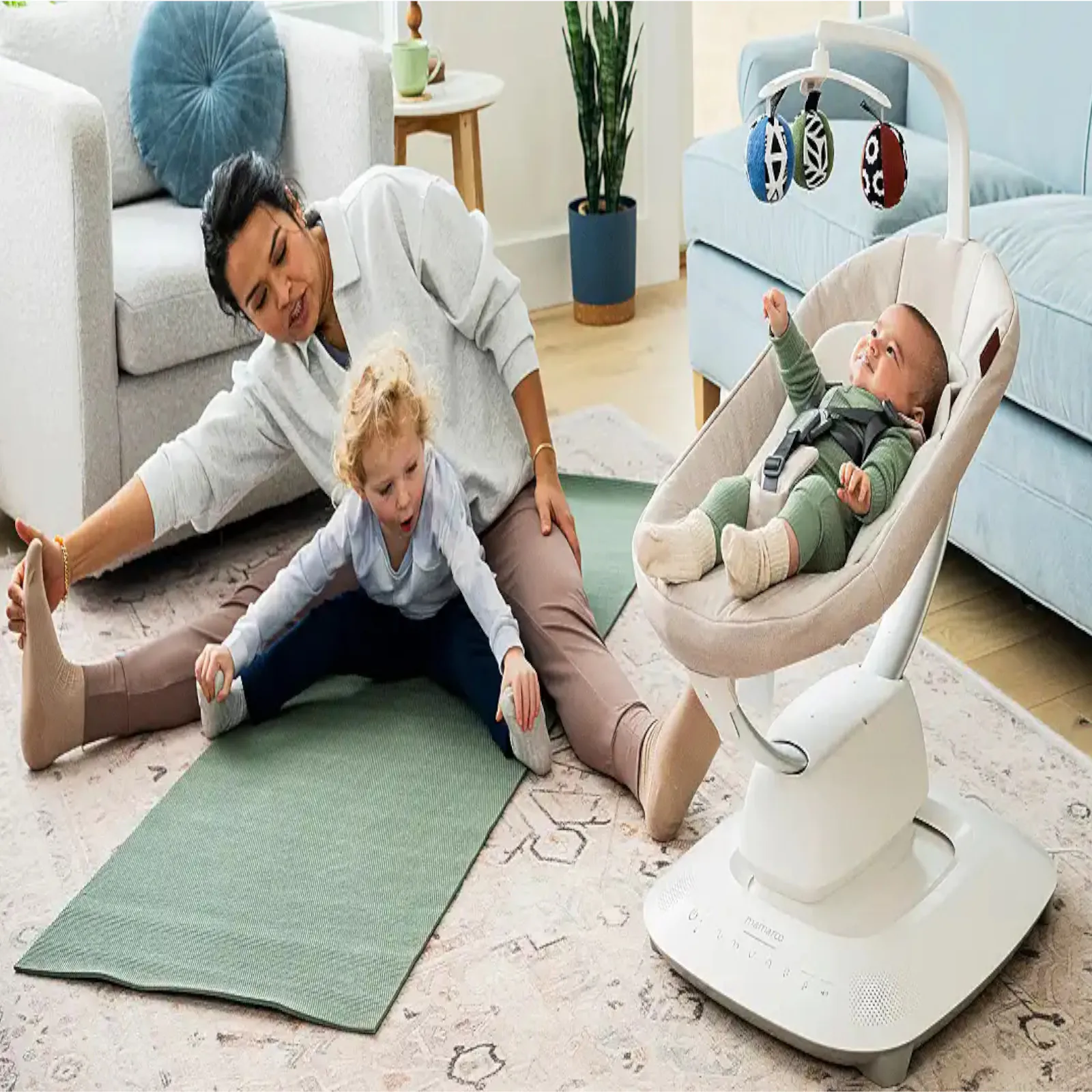 The Mamaroo Smart Swing is designed to move like you do, mimicking your natural motion to create the perfect place for baby to safely relax while you take a break. With five soothing motions, customizable speeds, and smart-home features, it adapts to your baby’s needs while giving you the freedom to focus on yours.