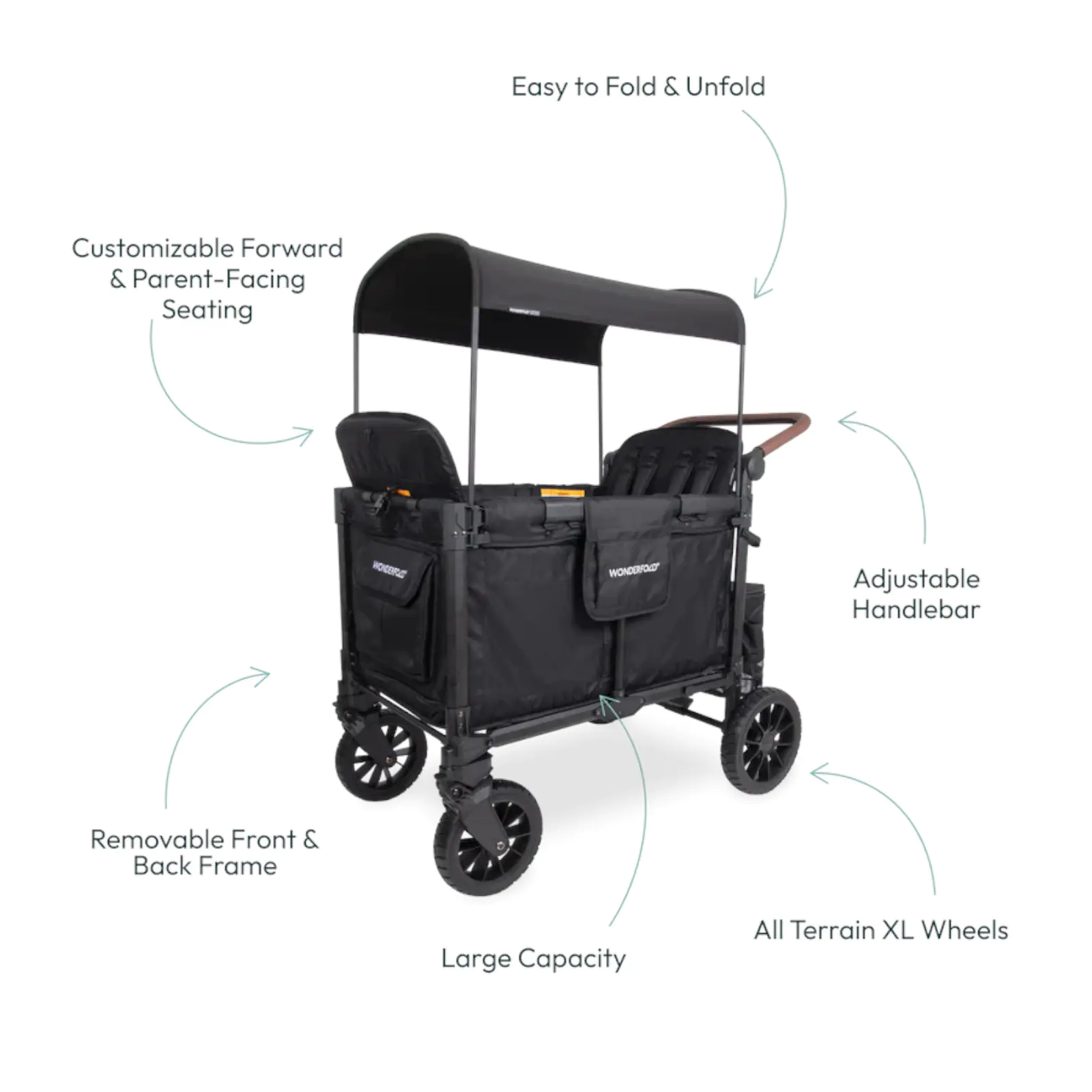 The adjustable canopy provides shade while the all terrain XL wheels with suspension ensure a smooth ride anywhere you go
